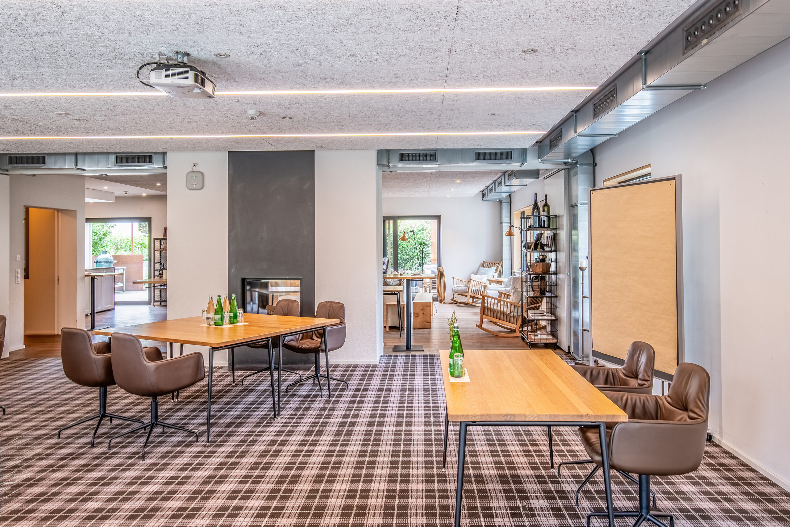 Das Denklokal besteht aus einem hellen, modern eingerichteten Plenarraum, einer gemütlichen Kaminlounge für Austausch in kleiner Runde sowie einer idyllischen Gartenterrasse für kreative Pausen im Grünen.